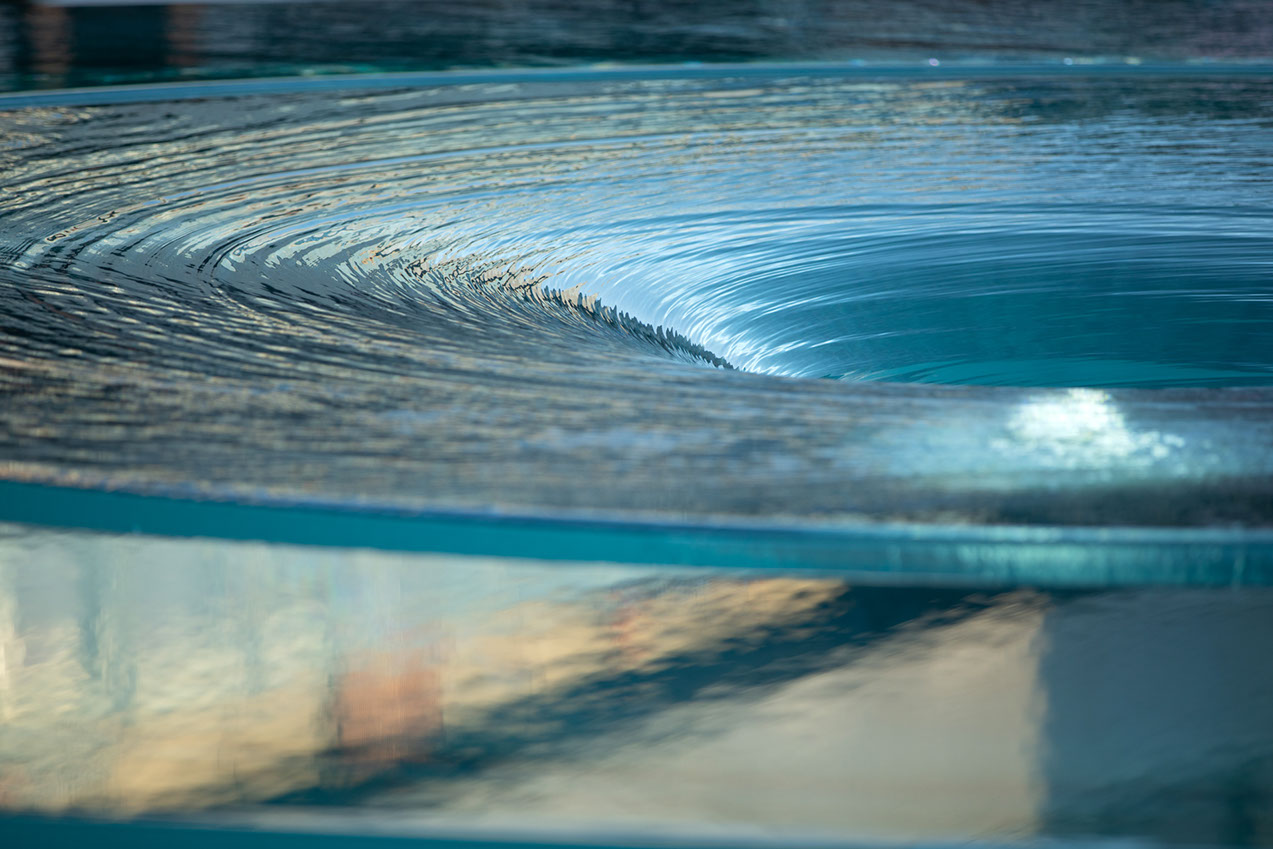 区别于常规单面板的外壁,此次漩涡的外围增加了一圈镜面溢水池,这种半包裹式的设计提升了漩涡整体的神秘感。