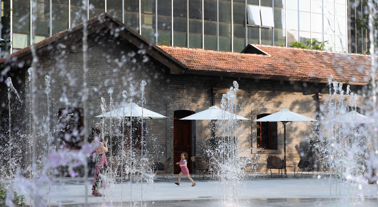 在最初的设计中,为唤起场地的历史记忆,我们用现代的手法设计了可以机械转动的“转车台”。当“转车台”的轨道与周边场地对接时,阵列直喷水效便会开启,似一列列火车飞奔而过。