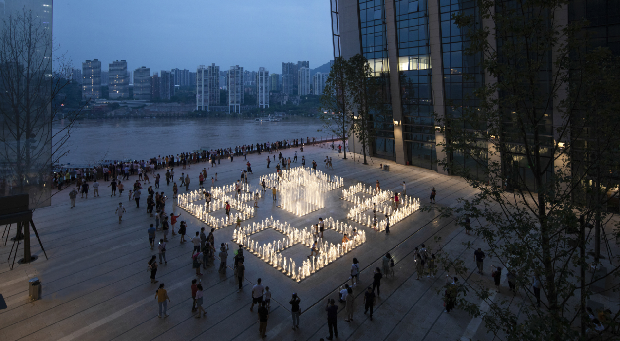 重庆来福士的旱喷水景,点连成线、线围成面、面造就块。