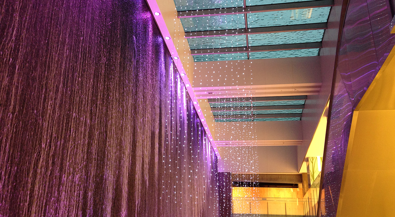 这是一个两层楼高的水幕墙,设计概念来源于“风调雨顺”。风调雨顺在中文中意思是风和雨来的正是时候,是一个庄稼丰收的好预兆。