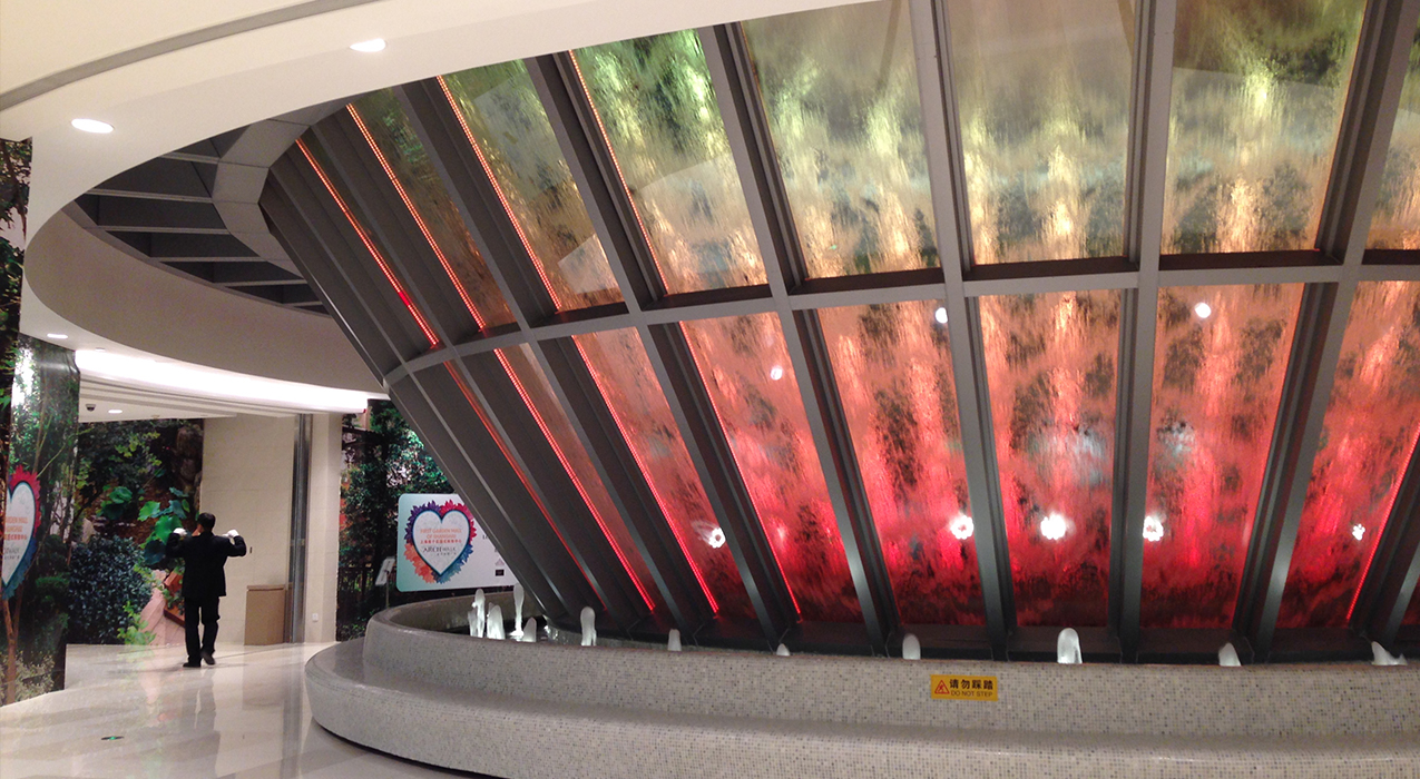 This is a two story high water cascade wall which given the meaning for ‘Feng Tiao Yu Shun (FTYS)’. FTYS in Chinese means wind and rain come on time which implied a harvest sign for crops. In this case, designing a FTYS water wall is to given a favorable vision for the harvest of shopping mall.