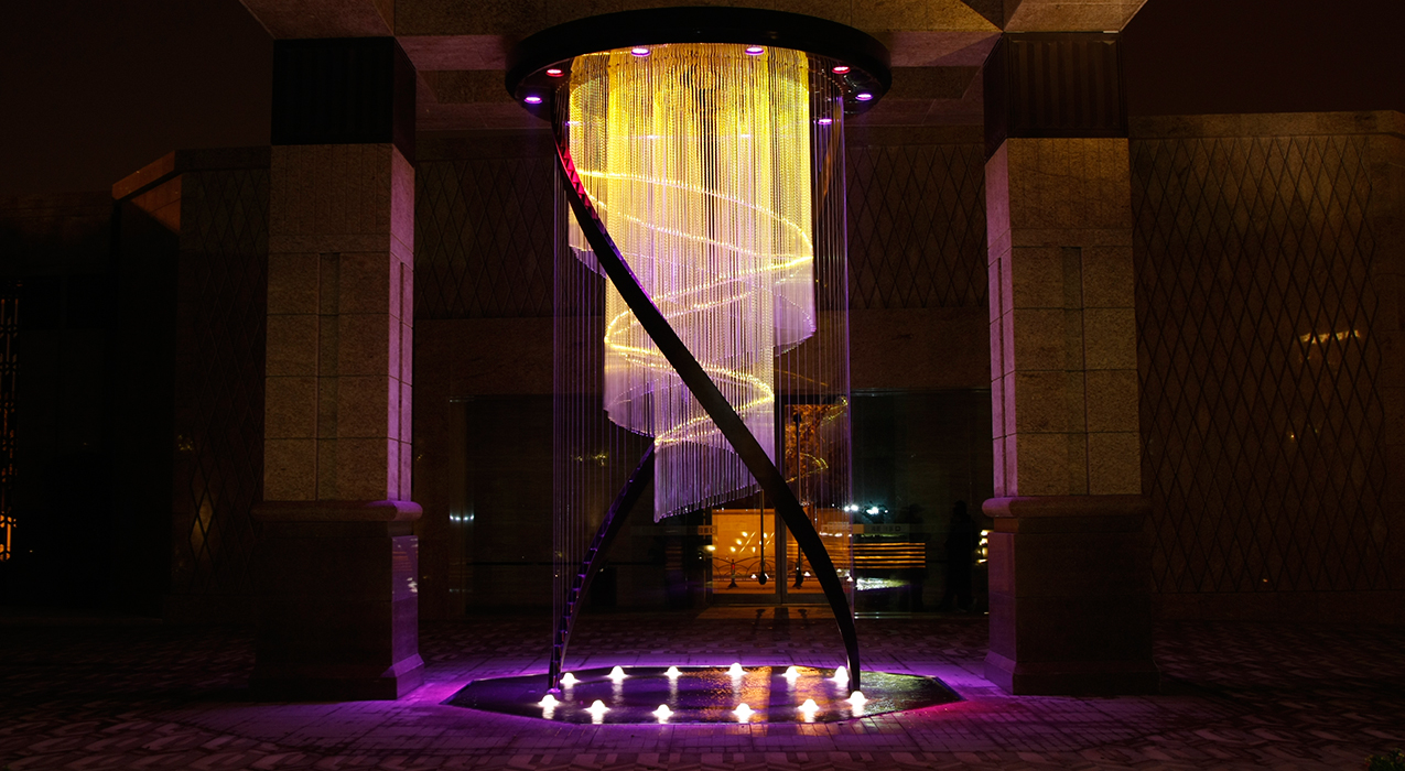 The spiraling up form of LED chandelier in the center of this feature, echo the outer ring sculpture, bringing a upward feeling to audience. The outer ring of the feature is a combination feature of water, stainless steel curve and mylar lace. Water flows along the mylar lace from top pan to the bottom of curve, finally influxes into the reflective pool. Several foam jets are ranged to a circle form to corresponding to the form of whole feature. Reflective pool extends overall effect.