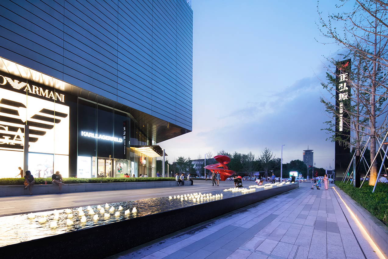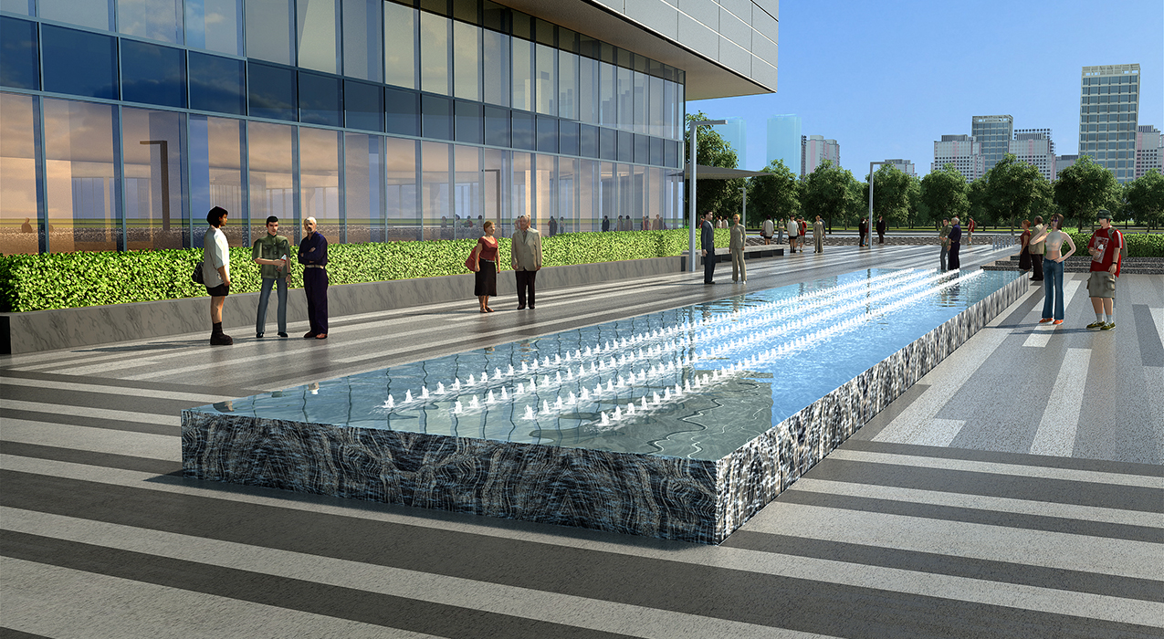 迎宾入口是第一视觉的形成起点,道路中央引入一池清泉碧波,与商场相对而望,妙趣自得。用沉稳的黑色石材搭配镜面水景,能碰撞出前场不凡的气质。随着太阳东起西落的映衬光线,水池显得尤为深邃、迷人。