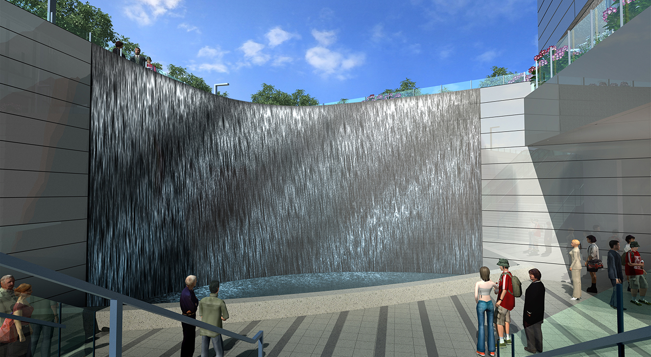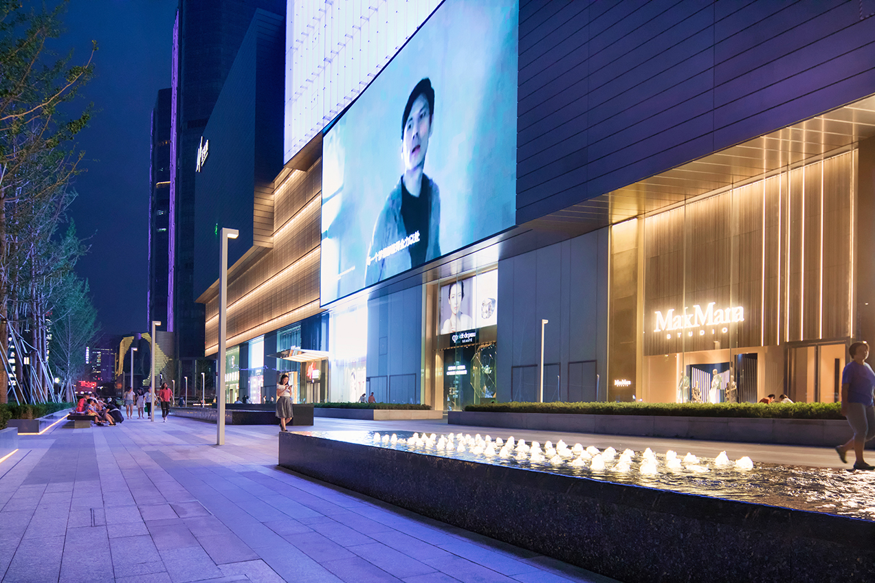 不求多、繁、高、大的堆砌,而在乎一点一滴一墙一水的巧思。将水幕墙按距离分段控制,编程的变化也使水幕墙呈现不同的效果。华灯初上,条条星光跃于水幕之中,有夏日雨后萤火虫之感。