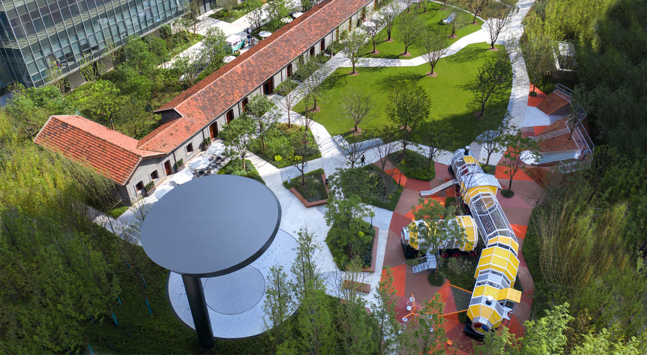 在最初的设计中,为唤起场地的历史记忆,我们用现代的手法设计了可以机械转动的“转车台”。当“转车台”的轨道与周边场地对接时,阵列直喷水效便会开启,似一列列火车飞奔而过。