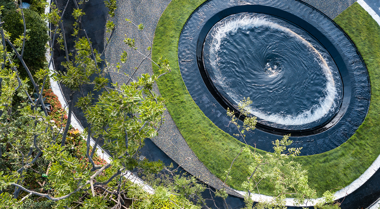 第一,我们根据椭圆的造型,设置了更加利于均衡上水的出水口位置。我们向景观设计顾问罗朗建议了土建的做法,他们也对土建的做法进行了优化,确保功能的实现和完成面的美观。