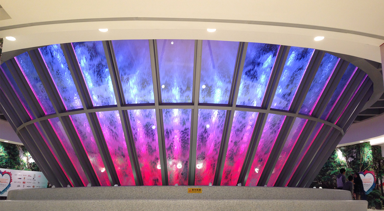 This is a two story high water cascade wall which given the meaning for ‘Feng Tiao Yu Shun (FTYS)’. FTYS in Chinese means wind and rain come on time which implied a harvest sign for crops. In this case, designing a FTYS water wall is to given a favorable vision for the harvest of shopping mall.