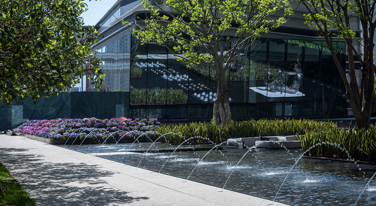跳跃的线泉一瞬间触活了一汪静水,高度错落的涌泉节奏起伏。水帘如珠串跳落,肌理搭配讲究几何美感。阳光下的光影依稀斑驳,大隐于都市,美不胜收。