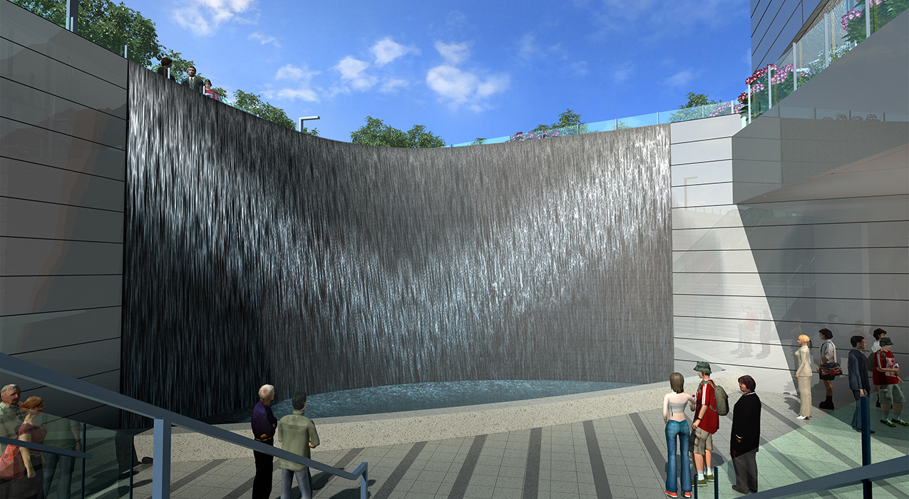 不求多、繁、高、大的堆砌,而在乎一点一滴一墙一水的巧思。将水幕墙按距离分段控制,编程的变化也使水幕墙呈现不同的效果。华灯初上,条条星光跃于水幕之中,有夏日雨后萤火虫之感。