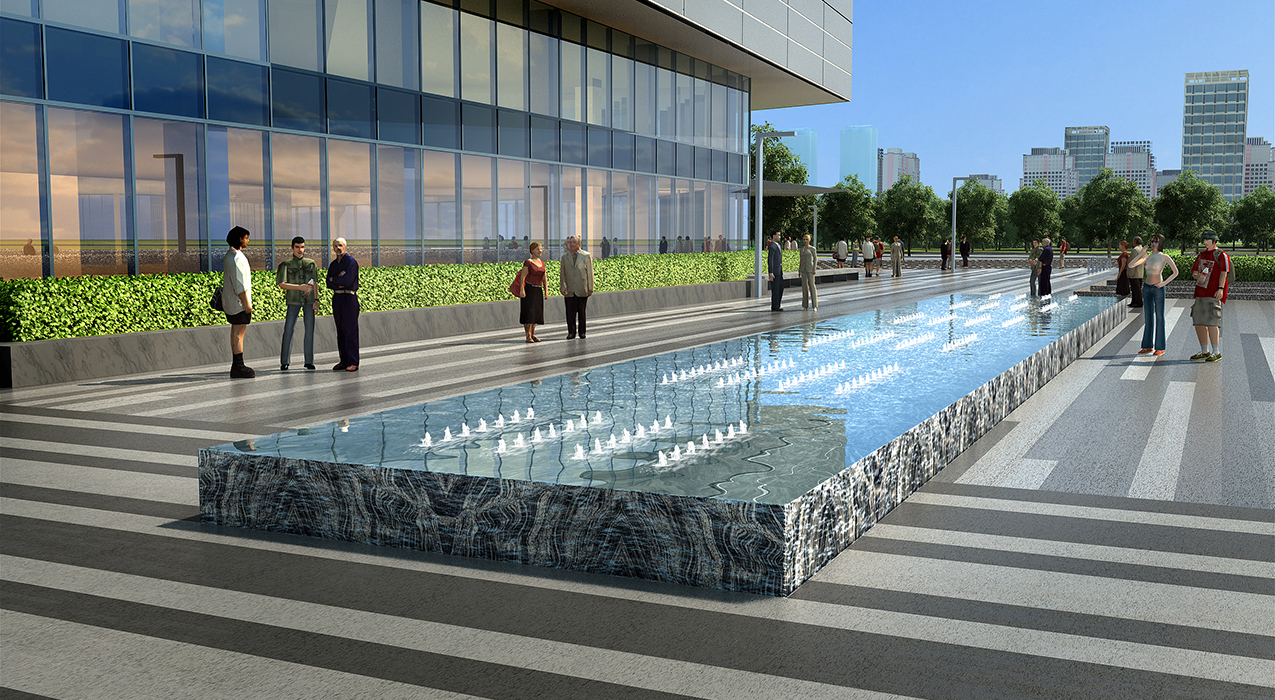 迎宾入口是第一视觉的形成起点,道路中央引入一池清泉碧波,与商场相对而望,妙趣自得。用沉稳的黑色石材搭配镜面水景,能碰撞出前场不凡的气质。随着太阳东起西落的映衬光线,水池显得尤为深邃、迷人。
